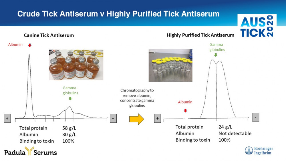 Tick antiserum is the mainstay therapy used by veterinarians to treat cats affected by the paralysis tick Ixodes holocyclus. However it is not without risk of acute anaphylaxis associated with administration of the currently available canine-derived tick antiserum. This project is investigating the effect of chromatographic purification on canine tick antiserum to produce a highly refined immunoglobulin product. Tick antiserum contains all the proteins found in normal dog serum, including albumin. It is hypothesised that anti-albumin IgE may be produced in cats following tick antiserum treatment and this may sensitise cats to acute anaphylaxis if subsequently administered. Removal of albumin and other unnecessary proteins may lead to less adverse reactions and improve the standard of care that can be offered by veterinarians. This project is a collaborative effort supported by Boehringer Ingleheim Animal Health Australia, Padula Serums and cooperating veterinarians.